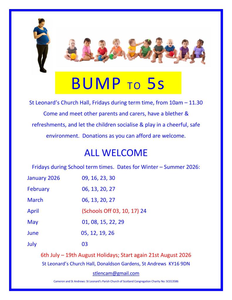 The Bump to Fives pre-school play group runs during school term time St Leonard’s Church Hall, Donaldson Gardens, St Andrews KY16 9DN on Friday mornings from 10 – 11.30am. All Mums, Dads, Carers and Grandparents with bumps, babies and /or toddlers are very welcome to attend. There will be two Volunteers on duty each week to help out. All the adults help with putting out and tidying away the toys and the Volunteers serve the refreshments (tea/coffee, juice /biscuits). We have a donations tin for contributions towards the costs, with a suggestion of £1.50 per adult per session, but people are welcome to give as they can afford.